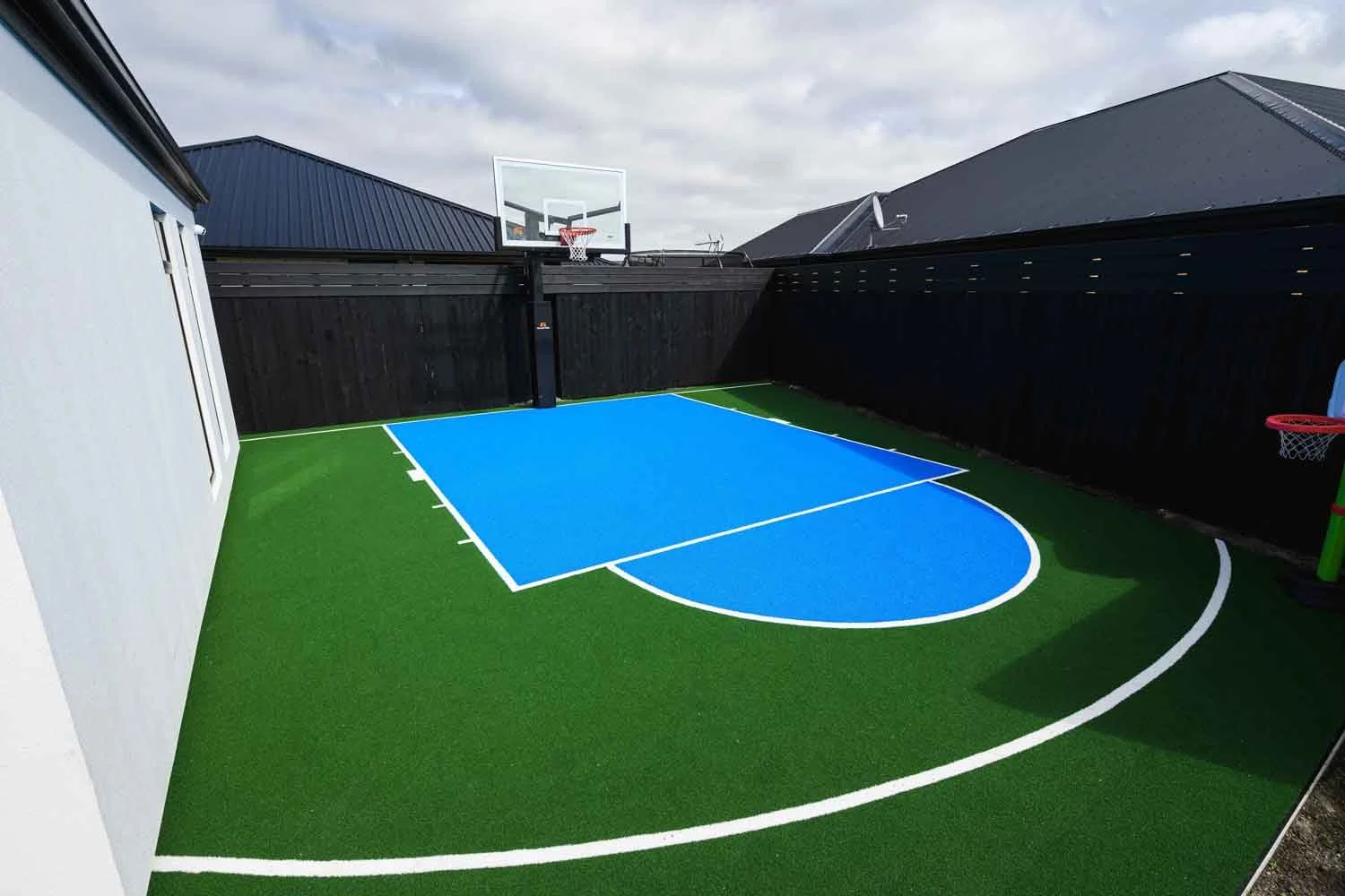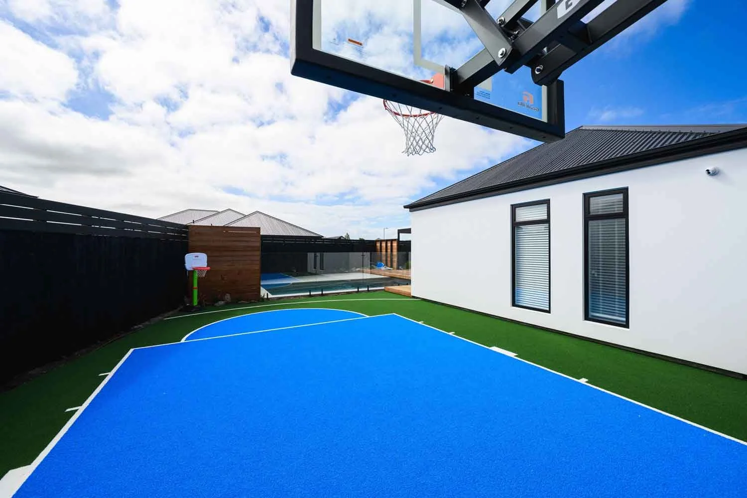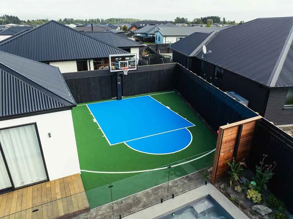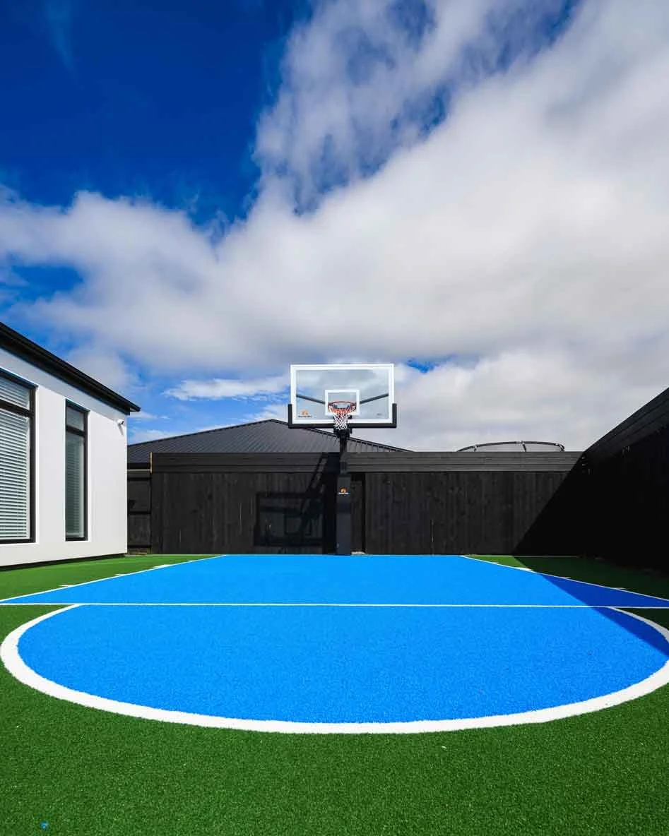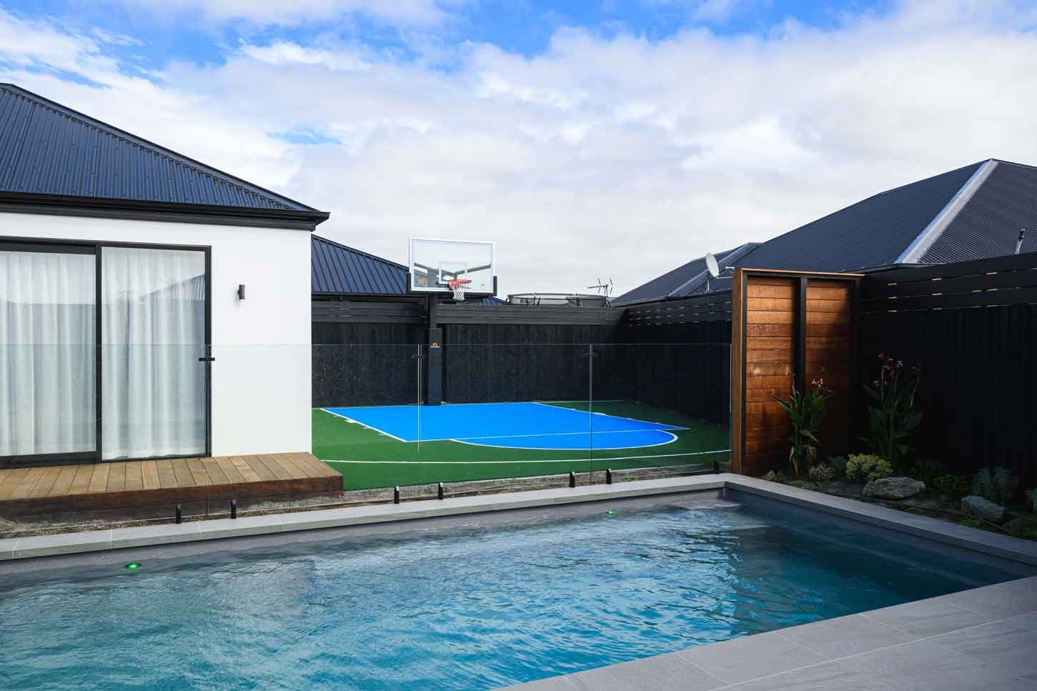 Backyard oasis with basketball court and artificial grass for Kiwi family living.
