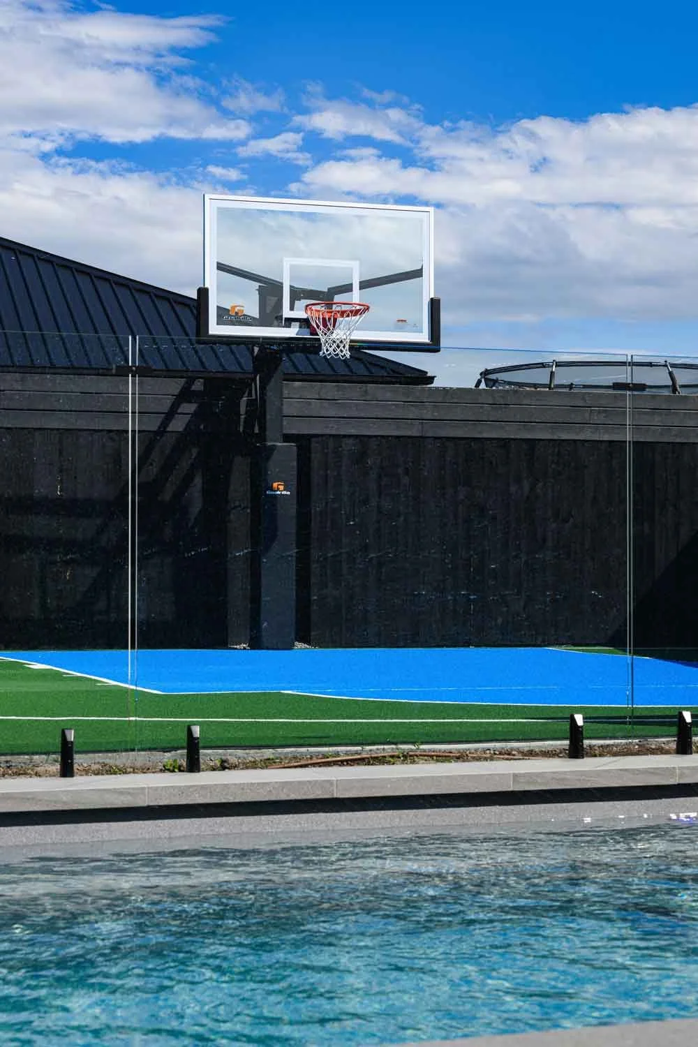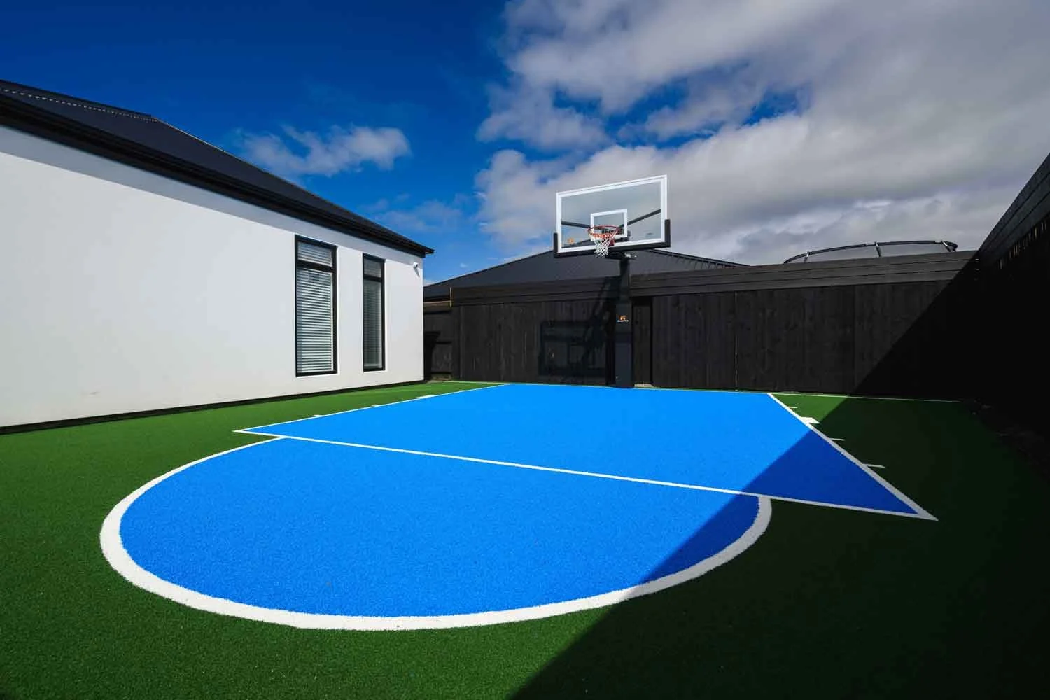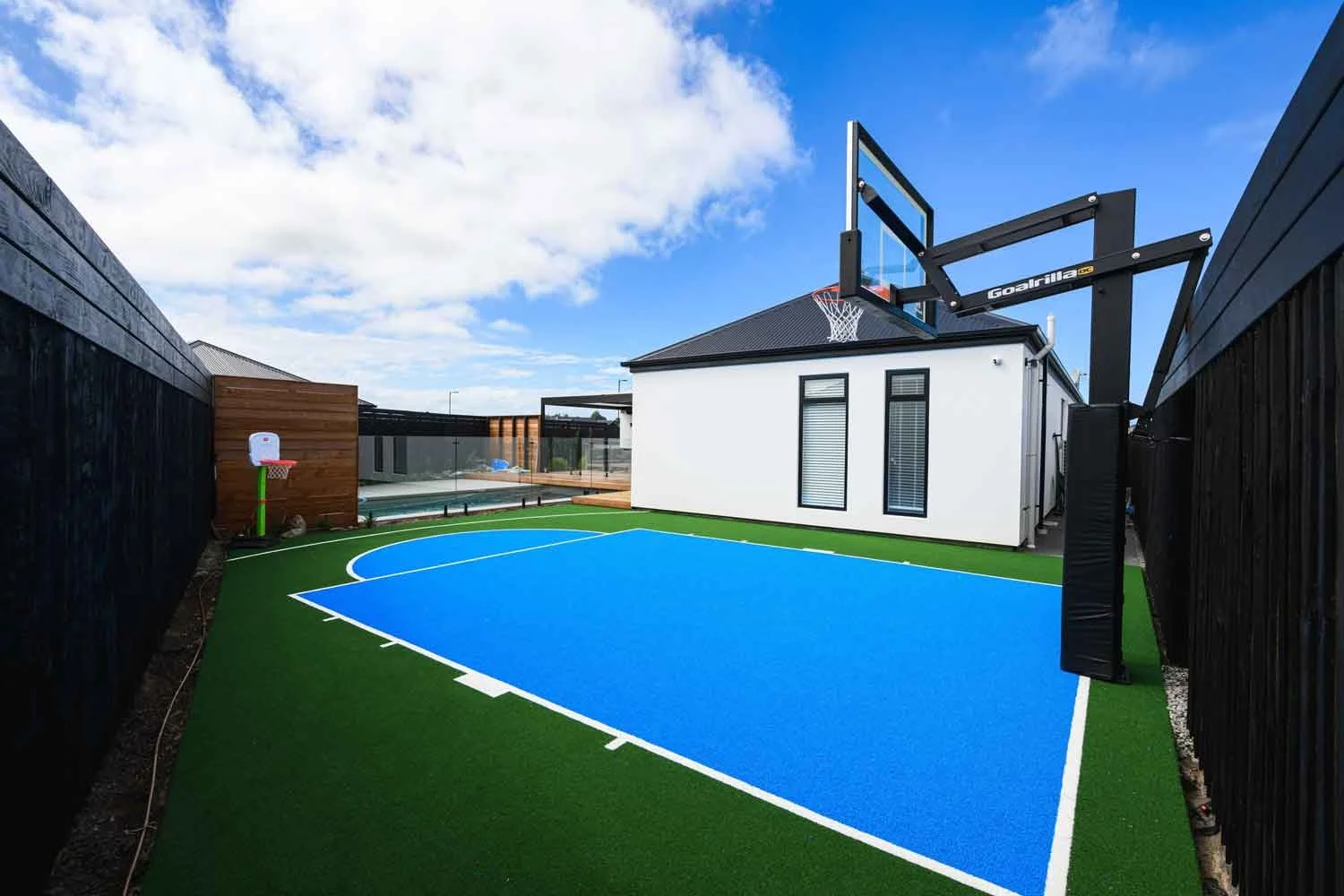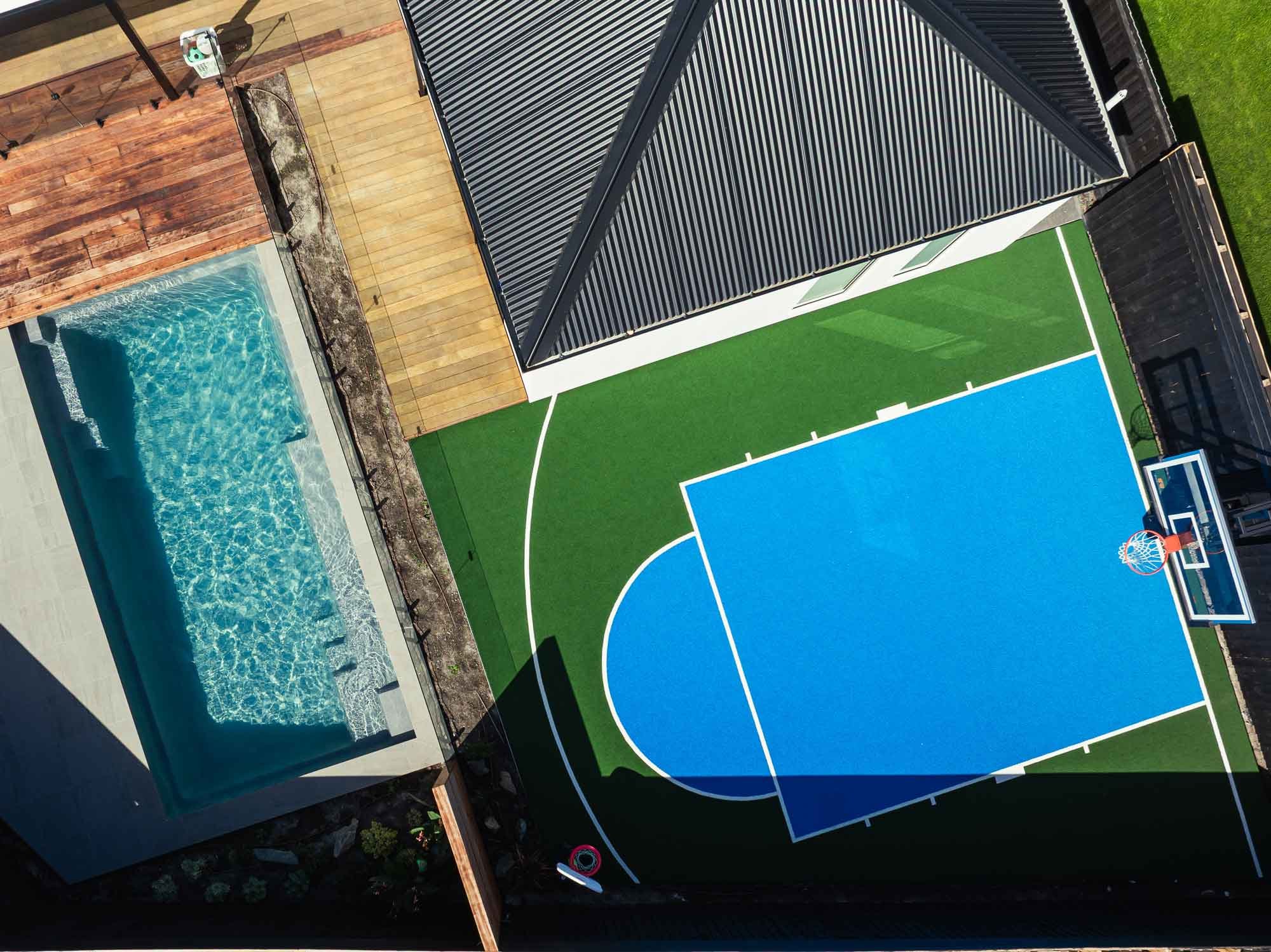 Backyard oasis with basketball court and artificial grass for Kiwi family living.